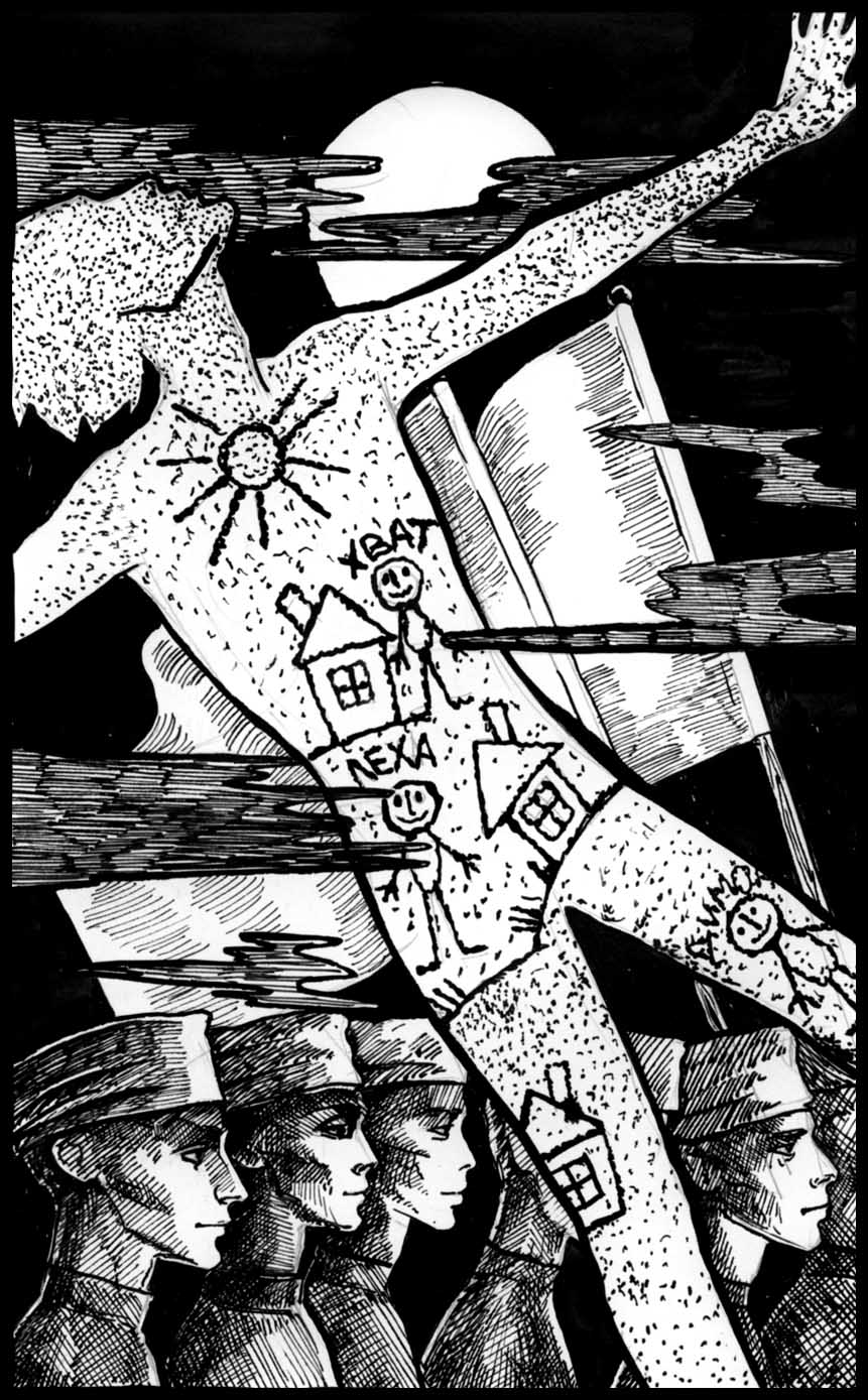 Шаг, еще шаг. Я не запомнил, когда именно ползущая масса превратилась в бесконечные шеренги солдат, ровно печатающих шаг… Уже хорошо видны люди в первой шеренге. Я гляжу поверх лиц; я помню слова учителей: «Никогда не смотри в лицо врагу. Лицо его – это иллюзия. Запомни, враг лишь притворяется человеком». И все равно я вижу, до чего беспощадны и холодны их глаза, в них нет испуга, а только трезвая опытность… Неужели? Мои мысли мечутся, тщетно пытаясь собраться воедино; где моя воля, та самая воля, которая должна ударить вот сейчас и одной силой мысли убить врага?
